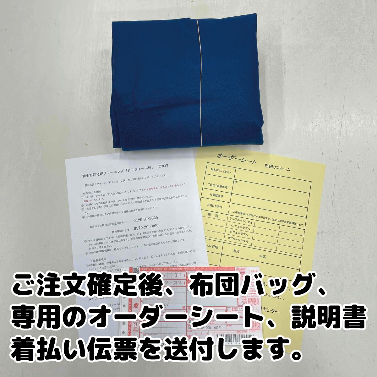 3,キットをお受取りください。オーダーシートに必要事項をご記入の上、ふとん等を詰めて同封の着払い伝票を使用し、当社までご発送ください(同封のご利用案内に、ヤマト集荷依頼のお電話番号の記載がございますのでご利用ください)
